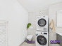 Une salle de bains moderne est équipée d’une baignoire, d’un meuble double vasque, d’un WC, ainsi que d’une machine à laver et d’un sèche-linge.