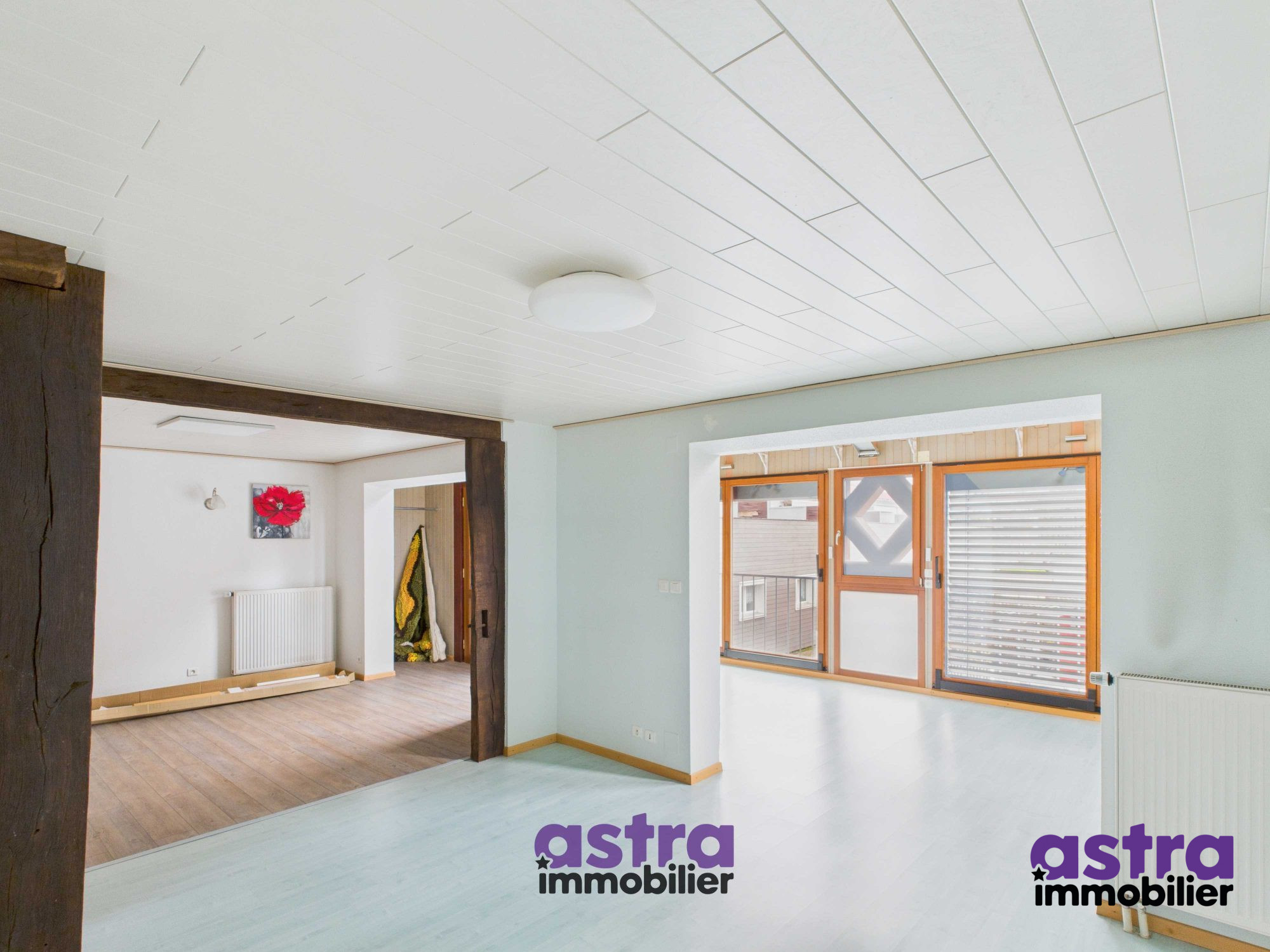 Description : Au rez-de-chaussée, vous trouverez : Un salon-séjour lumineux Une cuisine aménagée et équipée Un cellier Un WC indépendant À l’étage : Deux chambres Un bureau, idéal pour le télétravail ou une chambre d’appoint Une salle de bains avec WC Espaces complémentaires : Véranda de 21 m², parfaite pour profiter d’un espace de vie lumineux toute l’année Garage pour un véhicule Confort & équipements : Chauffage au gaz Menuiseries bois et aluminium Double vitrage Bon état général Un appartement offrant de beaux volumes et une organisation pratique, située dans un secteur calme et recherché de Waldighoffen. À visiter sans tarder.